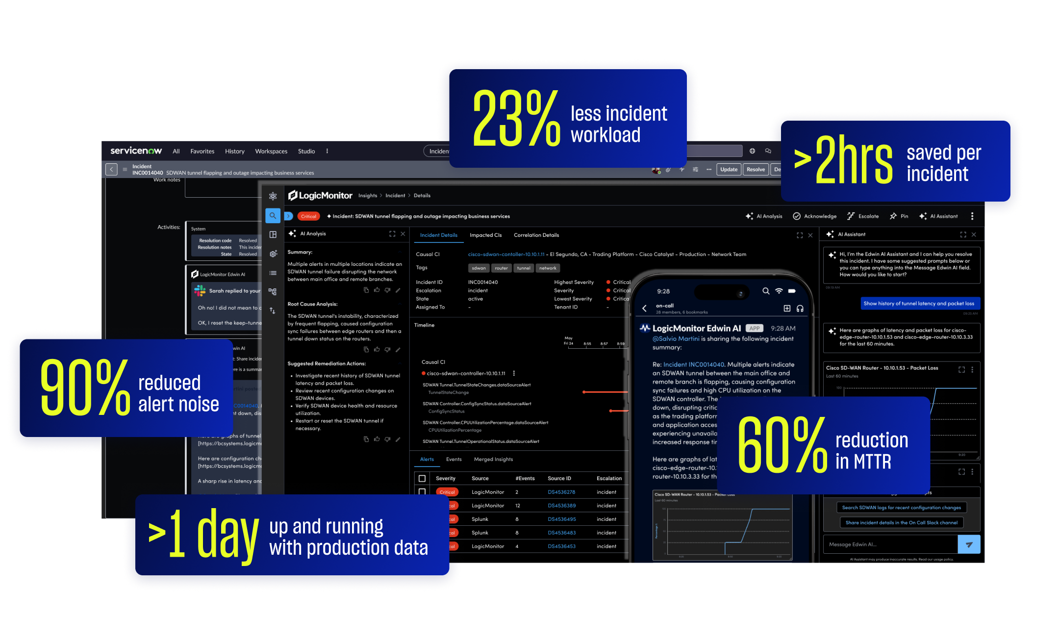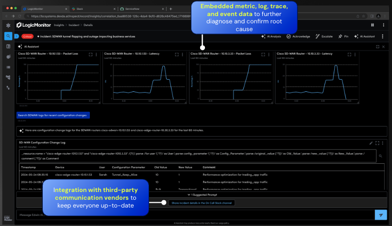 AI-driven analysis identifies the root cause of incidents faster. Find the root cause of issues more efficiently, cutting down on time spent troubleshooting by more than 2 hours per incident.